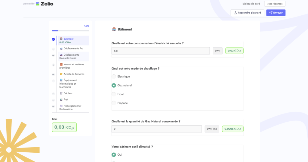 Concrètement, elle fonctionne comme un formulaire intelligent personnalisable, relié au moteur de calcul carbone de Zelio Impact. En répondant à une série de questions adaptées à son secteur d’activité, une entreprise obtient en quelques minutes une estimation structurée de ses principaux postes d’émission de gaz à effet de serre — sans avoir à mobiliser les ressources nécessaires à un bilan carbone complet.